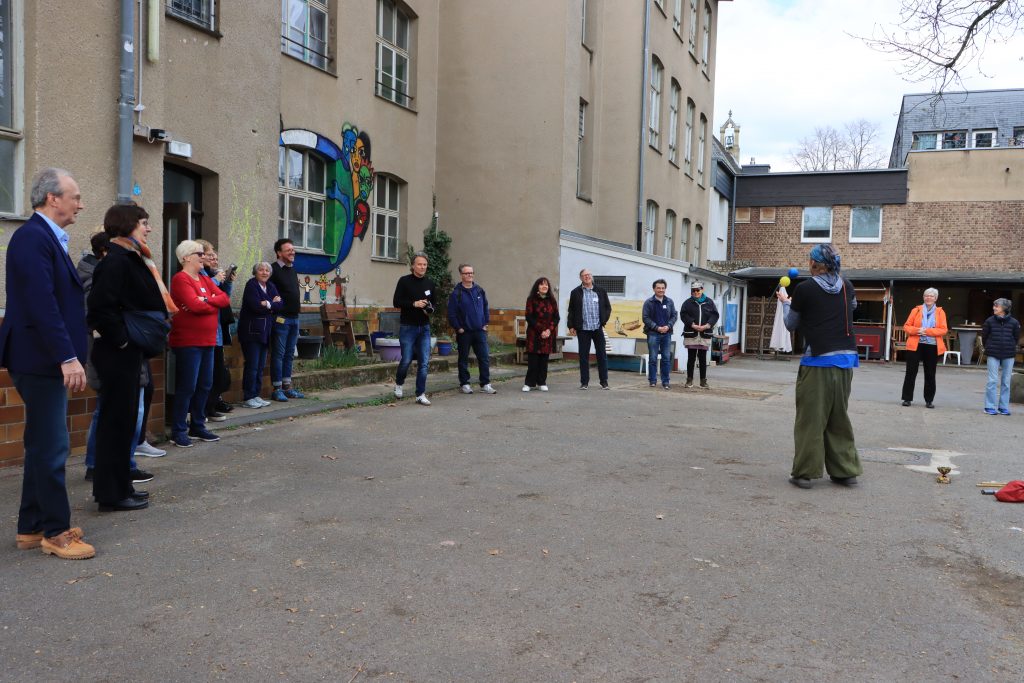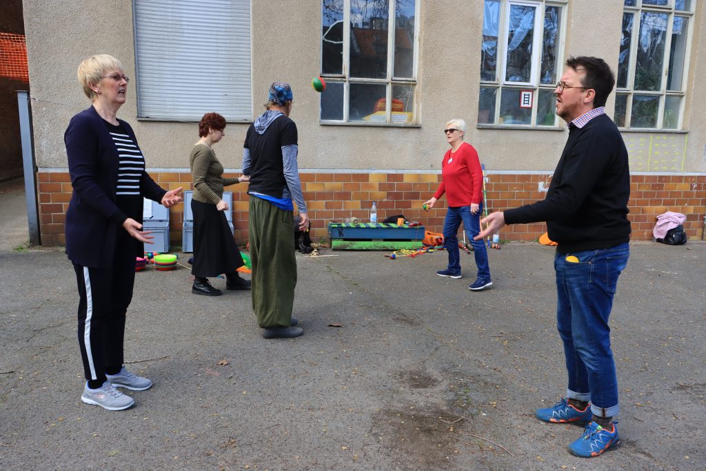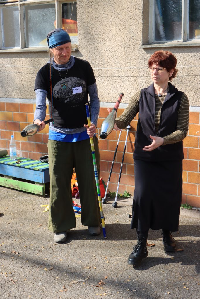 Das Wetter spielte mit, sodass der Jonglagekurs mit Tobias und Regina draußen stattfinden konnte. „Es hat so viel Freude gemacht, so viele Sachen auszuprobieren“, erzählte Frauke. Sie unterstützt den Verein mit regelmäßigen Yoga-Angeboten, auch beim Begegnungstag in Dorsten. „Aber ich habe es heute sehr genossen, auch nur mal Gast zu sein und mich ganz viel auszutauschen.“